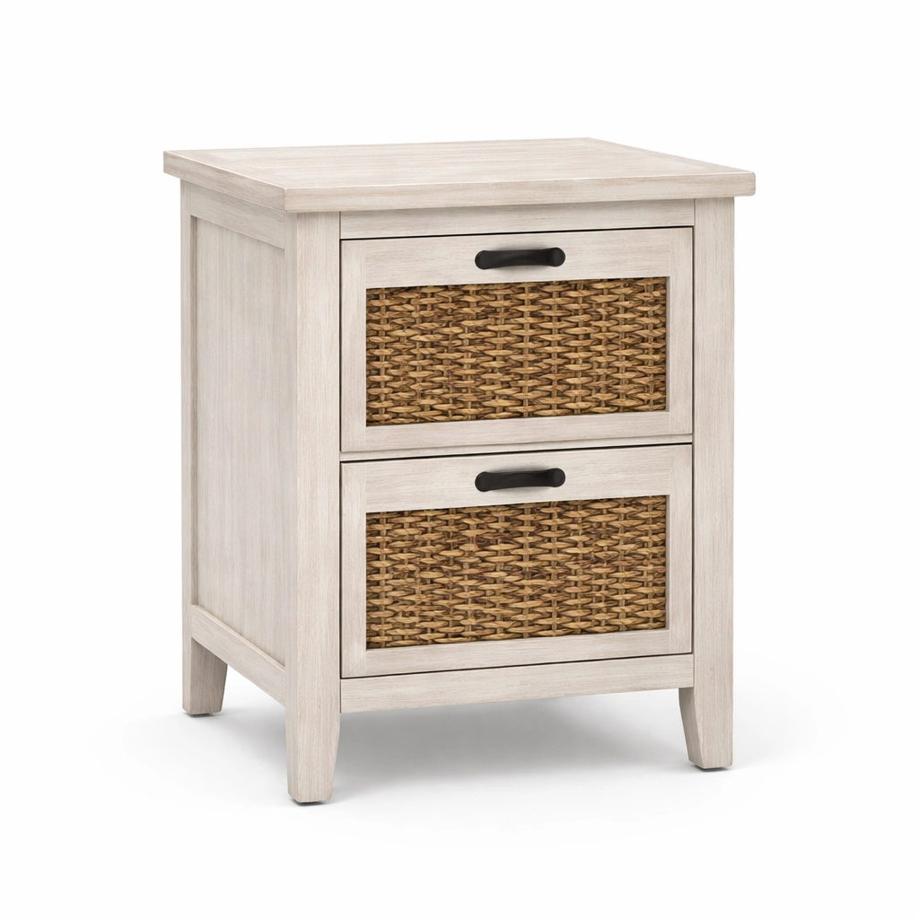 Nachttisch Holz mit Weidenkörben Weiß