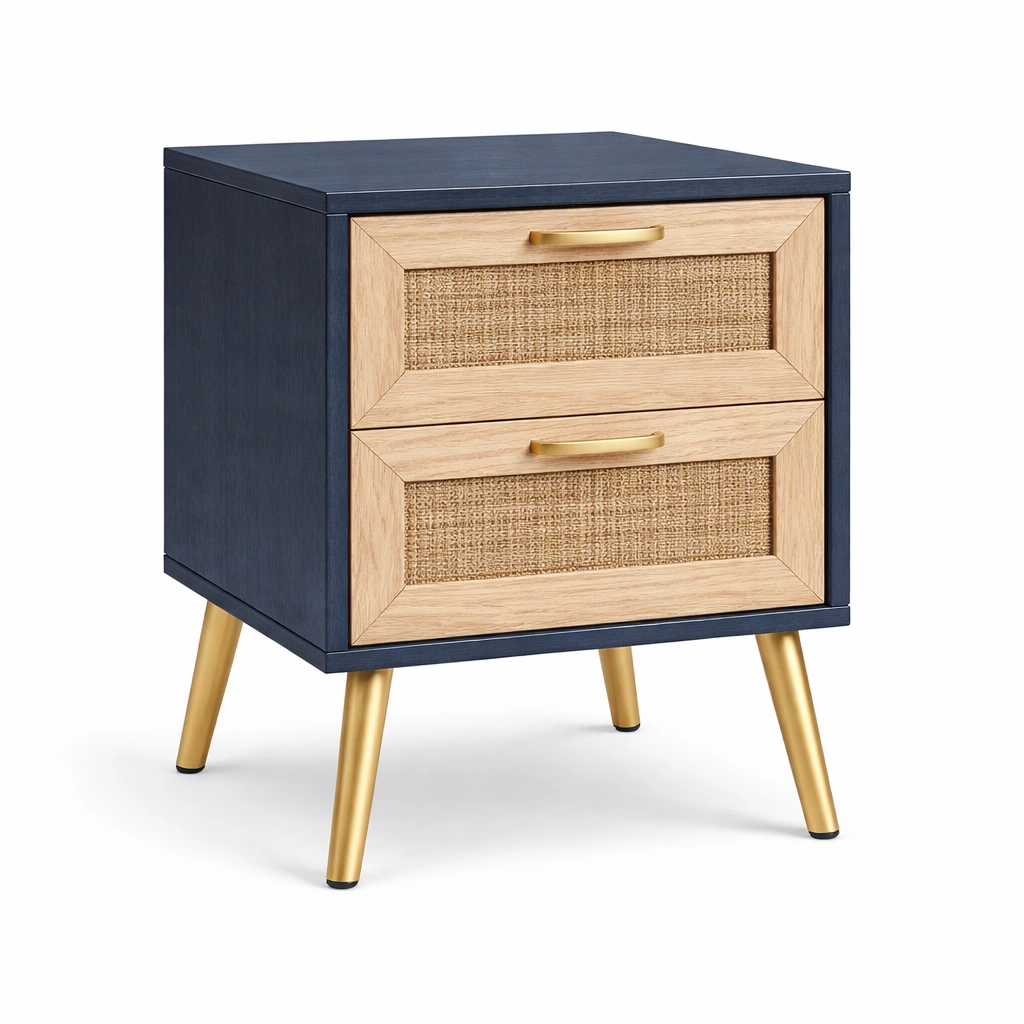 Nachttisch Holz mit Rattanschubladen Blau Gold