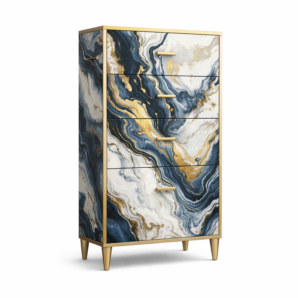Material: MDF mit Marmormuster, Aluminiumgriffe, Stahlbeine